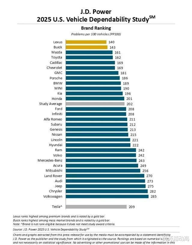 榜单显示,豪华车品牌中PP100数值最小的是雷克萨斯、凯迪拉克和保时捷。雷克萨斯连续三年居首,2025年度数值140。凯迪拉克169,北美认可度高。保时捷186,可靠性出色。